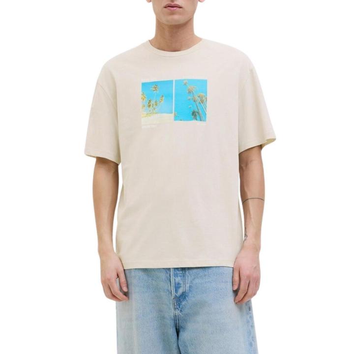 Camiseta Jack and Jones. Modelo Porto. Color beige. Cuello redondo. Manga corta. Ajuste regular. Imagen estampada en el pecho. Detalles en azul.