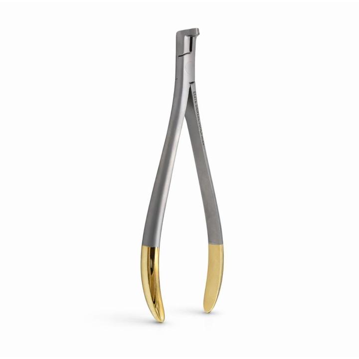 El Alicate de Corte Distal Mini de Elite Dental Tools® está diseñado para ofrecer máxima precisión y durabilidad en procedimientos ortodónticos. Fabricado con acero inoxidable alemán de alta calidad y una punta reforzada con tungsteno, este instrumento garantiza un corte limpio y seguro de los extremos del alambre distal sin dañar los tejidos circundantes. Su diseño compacto y ergonómico, junto con mangos dorados antideslizantes, proporciona comodidad y control durante su uso clínico. Ideal para ortodoncistas que buscan precisión y calidad profesional. **Características:** * Punta de tungsteno para un corte resistente y preciso * Acero inoxidable alemán de alta durabilidad * Diseño mini para un acceso más fácil en zonas difíciles * Mangos dorados ergonómicos y antideslizantes * Certificación CE – cumple con estándares internacionales