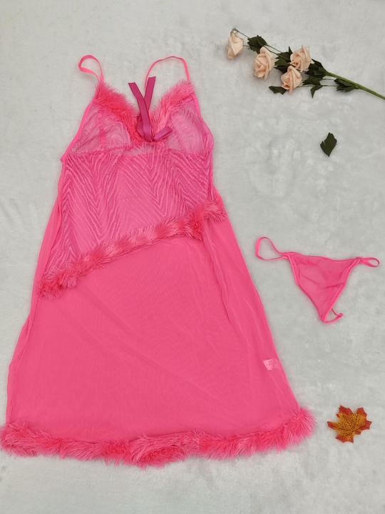 Conjunto de lencería sexy de malla de felpa con dobladillo ondulado camisón sexy