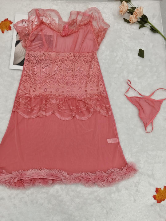 Conjunto de lencería sexy de malla de felpa con dobladillo ondulado camisón sexy