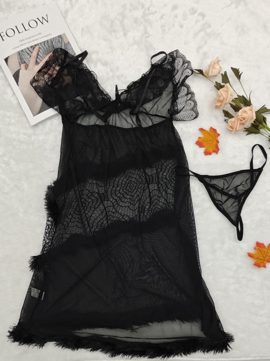 Conjunto de lencería sexy de malla de felpa con dobladillo ondulado camisón sexy