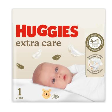 Los Pañales Huggies Extra Care Talla 1 (2-5 kg) están diseñados para ofrecer máxima suavidad y protección en recién nacidos, cuidando su piel en todo momento.