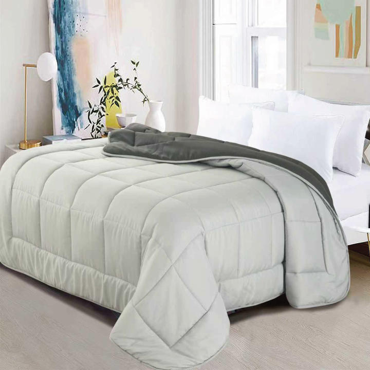 Diseño bicolor reversible (doble color liso) y acolchado a cuadros, permitiendo renovar la decoración al instante.