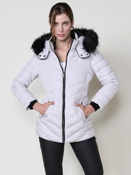 Chaqueta acolchada de mujer con cuello alto forrado en efecto pelo y capucha extraíble con cremallera. Forro interior de efecto pelo que proporciona calidez, complementado con un detalle desmontable con botones a presión para personalizar según el clima. Corte a la cadera que garantiza comodidad y versatilidad en looks casual chic e invernales.