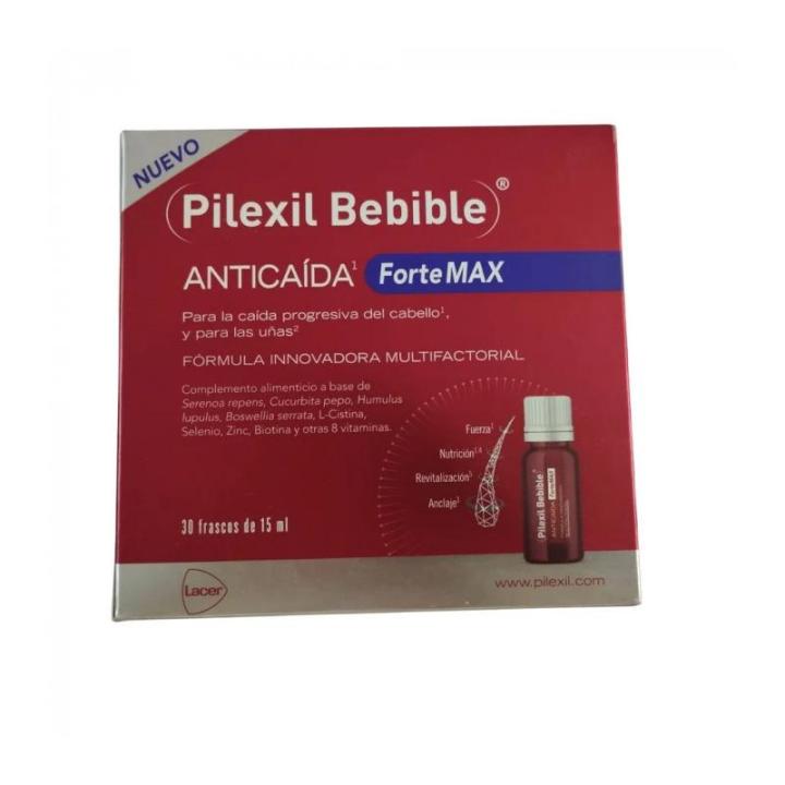 Pilexil Bebible Anticaída Forte MAX es un complemento alimenticio de última generación en formato bebible, desarrollado por Lacer para combatir la caída progresiva del cabello y fortalecer las uñas desde el interior. Su avanzada fórmula multifactorial líquida combina extractos naturales, aminoácidos, minerales y vitaminas esenciales en una solución fácil de absorber.