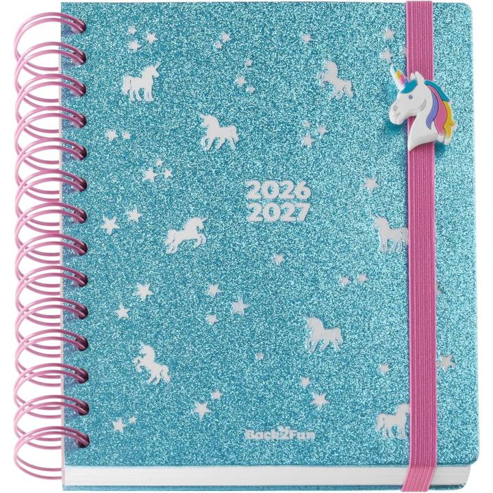 🦄 DISEÑO UNICORNIO: Tapa con purpurina azul, espiral doble metálico rosa y abalorio unicornio que se convierte en pulsera.