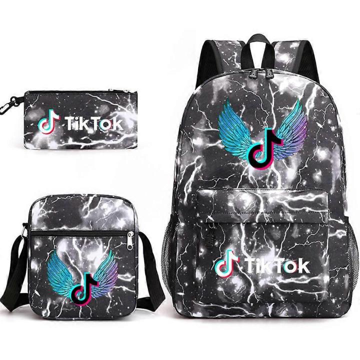 Mochila escolar Tiktok de tres piezas, mochila informal para estudiantes, mochila para exteriores de gran capacidad, bolso de lona informal, negro relámpago ~ 1