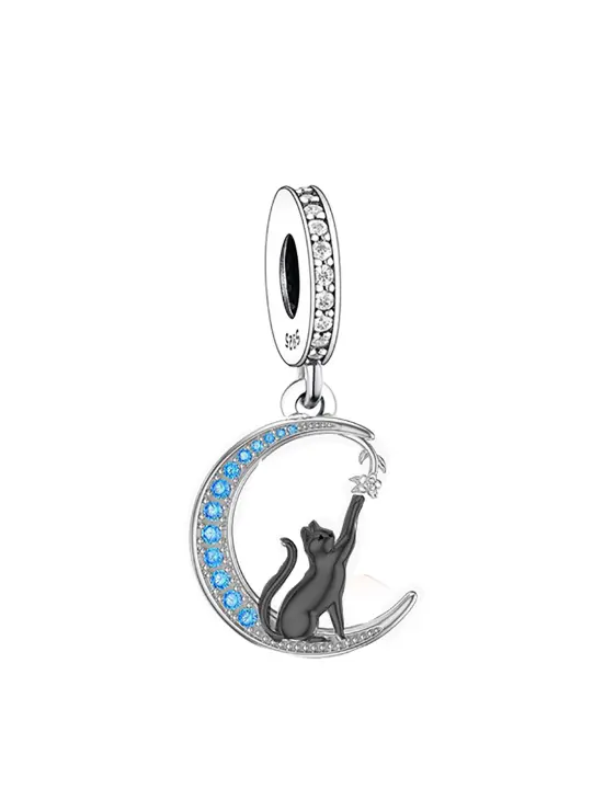 Colgante de Plata de Ley 925 con forma de luna creciente y gato negro, abalorio compatible con Pulsera Original, joyería para mujer