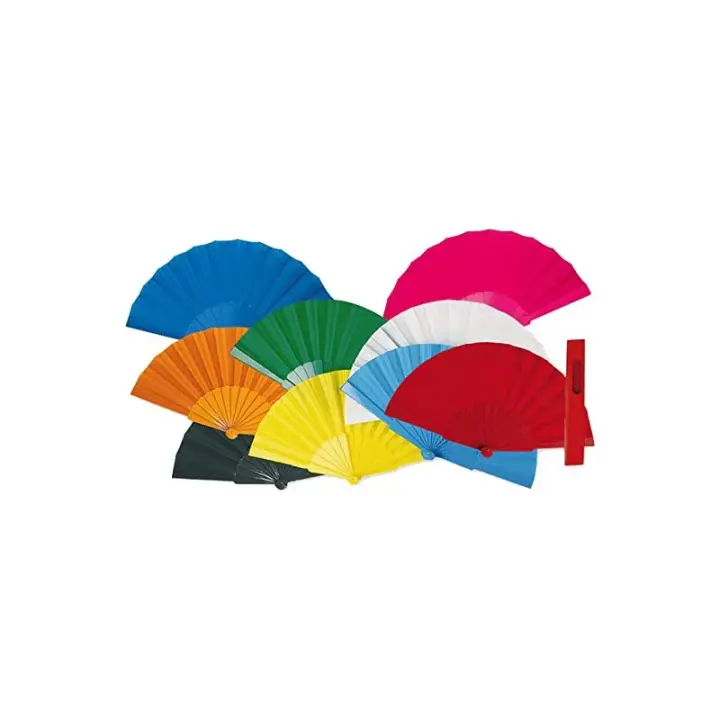 Abanicos de colores para fiestas y eventos. Originales abanicos de colores variados para dar a las invitadas en Bodas, Comuniones y celebraciones. Con 16 varillas y resistente tela en poliéster. Medidas: 43 x 23 cm. Presentados en una caja de cartón.
