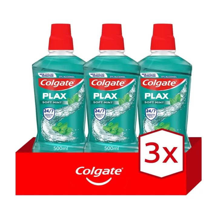 Enjuague bucal Colgate Plax Soft Mint protección 24H, antibacteriano 500ml. Pack 3
