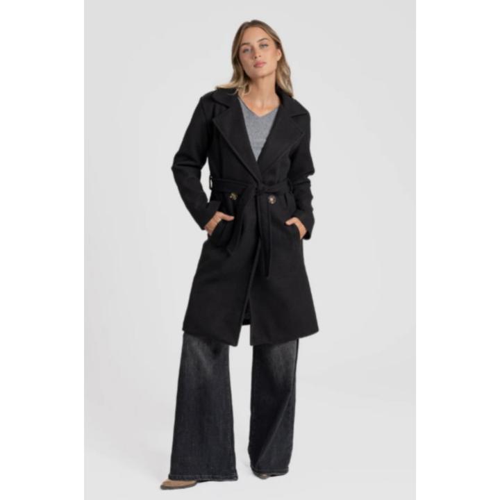 Cierre cruzado con botones y cinturón.