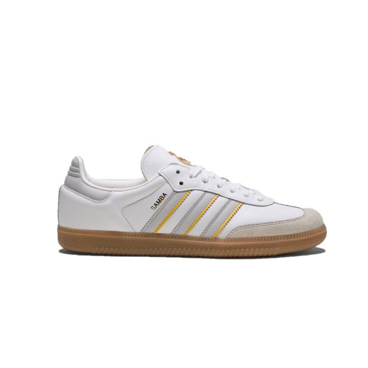 Bota adidas clásica creada para seguidores del Real Madrid.Creada para que los fans del Real Madrid puedan presumir de estilo futbolero fuera del estadio. La zapatilla Samba, un icono del calzado adidas, es famosa por su empeine de piel suave y puntera de ante en forma de T. Este par se ha confeccionado en los famosos colores de la primera equipación del Real Madrid e incorpora un escudo del equipo en el refuerzo del talón, para que no quepa duda de cuál es tu equipo favorito.