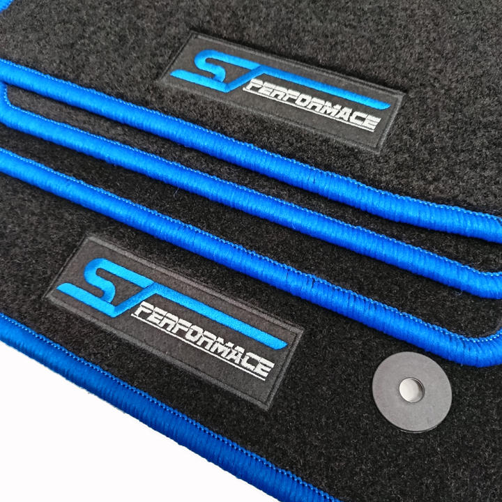 Alfombrillas de moqueta velour con logo y borde bordado en hilo de gran calidad azul a medida para FORD Focus IV (todos los modelos) desde 2018 hasta hoy.