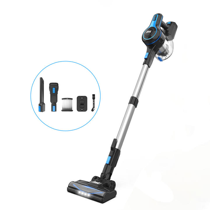 【Cepillo de piso motorizado LED flexible】La aspiradora inalámbrica está equipada con un cepillo motorizado de turbina 2 en 1. No es necesario cambiar el cabezal del piso para limpiar el piso duro y la alfombra de pelo bajo. La maniobrabilidad de 150 ° gira hacia los lados y 90 ° hacia arriba y hacia abajo le permite limpiar fácilmente las esquinas ciegas debajo de los muebles. 4 luces LED ayudan a la aspiradora inalámbrica a iluminar cada rincón oscuro y rastrear la suciedad.