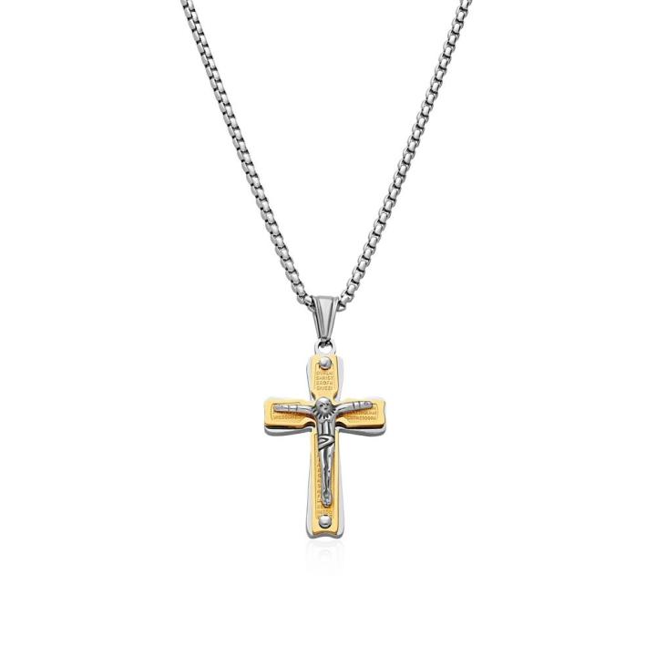 AVANCY - Collar Cruz Cristo Bicolor Acero 316 L. Chapado en oro 18 klts. Fabricado en España. Collar Cruz Cristo Bicolor Acero 316 L. Acabado brillo y chapado Oro 18 Klt. Cierre Mosquetón. Cadena largo 55 cm. Grosor cadena 2 mm. Medidas cruz 21 x 30 mm. Grosor 3.5 mm.