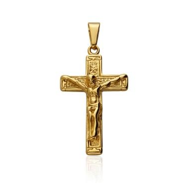 Cruz Cristo Relieve Acero 316 L. Cruz con Cristo en relieve acabado chapado en Oro de 18 klt. Medidas: 40 x 25 mm.