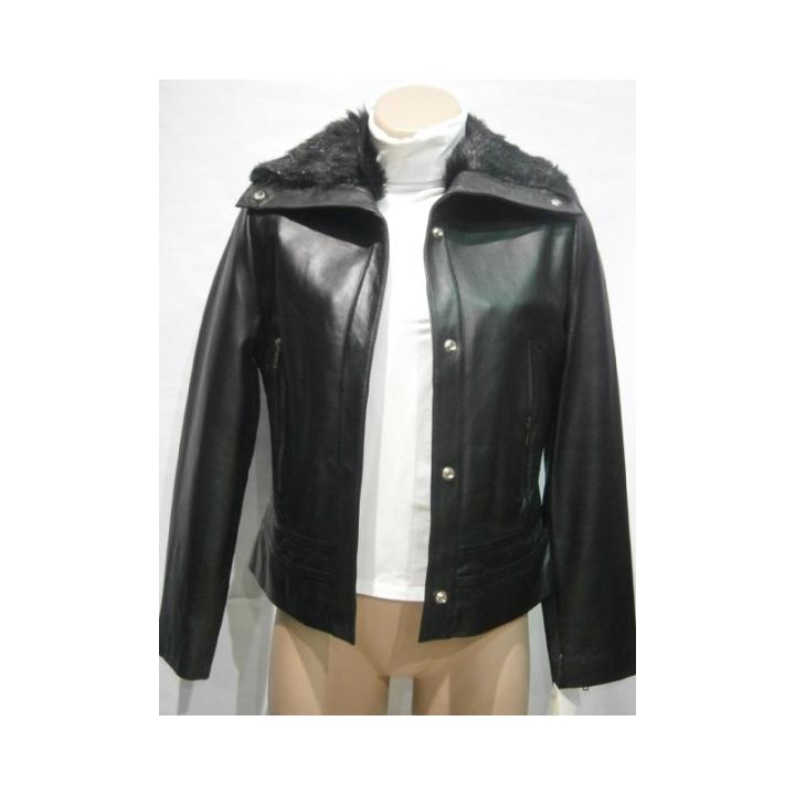 Cazadora de señora de piel en color negra, cierre por broches de presión. Cuello de pelo, piel de napa ligera y suave.