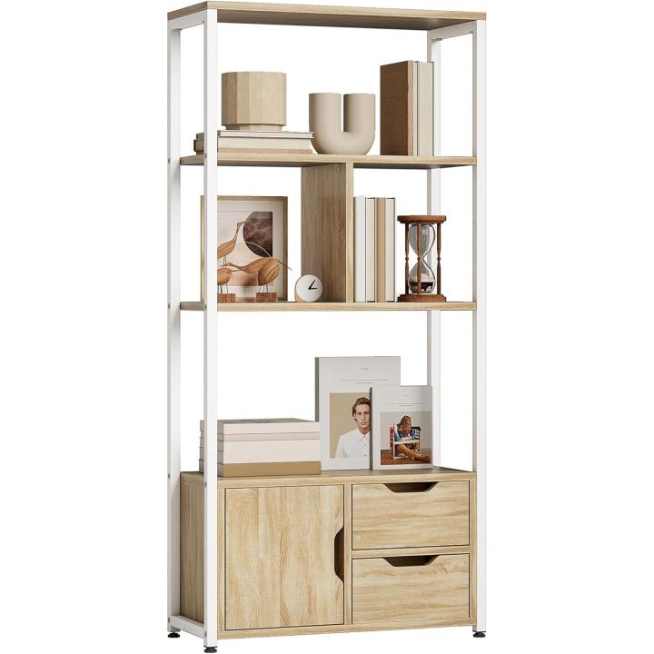 AMPLE STORAGE SPACE: With open and closed spaces, this multifunctional book shelf has 4 shelves, 1 compartment with door and 2 drawers for storing books, photos, plants and other decorative items