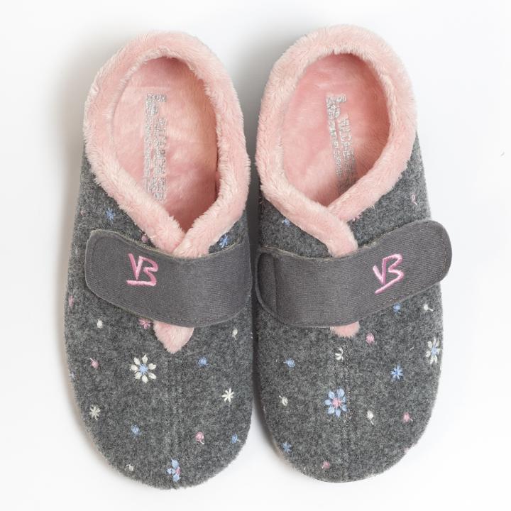 Zapatilla de casa cerrada modelo 4303 de la marca española Vulca-Bicha fabricada en un tejido cálido y suave en gris ribeteada en rosa con estampación de flores con ajuste de velcro en el empeine. Su suela es de caucho natural, flexible, antideslizante y tiene plantilla extraíble. Fabricado en España.