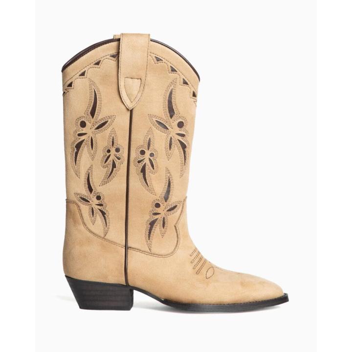 Botín estilo cowboy. Caña con cortes geométricos. Tiradores en los laterales. Corte en contraste de materiales y colores. Punta redonda. Cremallera en el lateral interior. Altura de tacón 3,5 cm. Altura de la caña 23 cm.