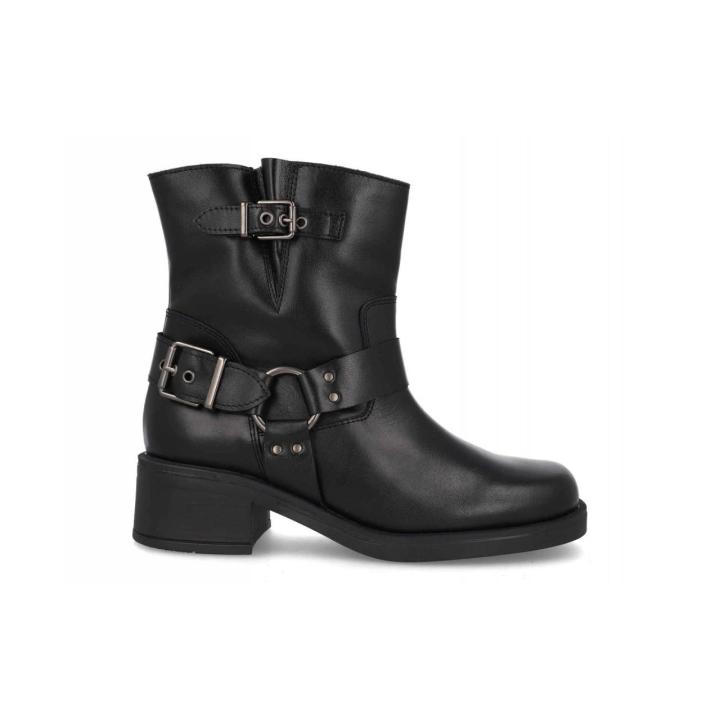 Haz una declaración de estilo con estos botines de mujer de inspiración motera. Fabricados en piel lisa de alta calidad en color negro, estos botines son robustos, duraderos y absolutamente imprescindibles para un look cañero.