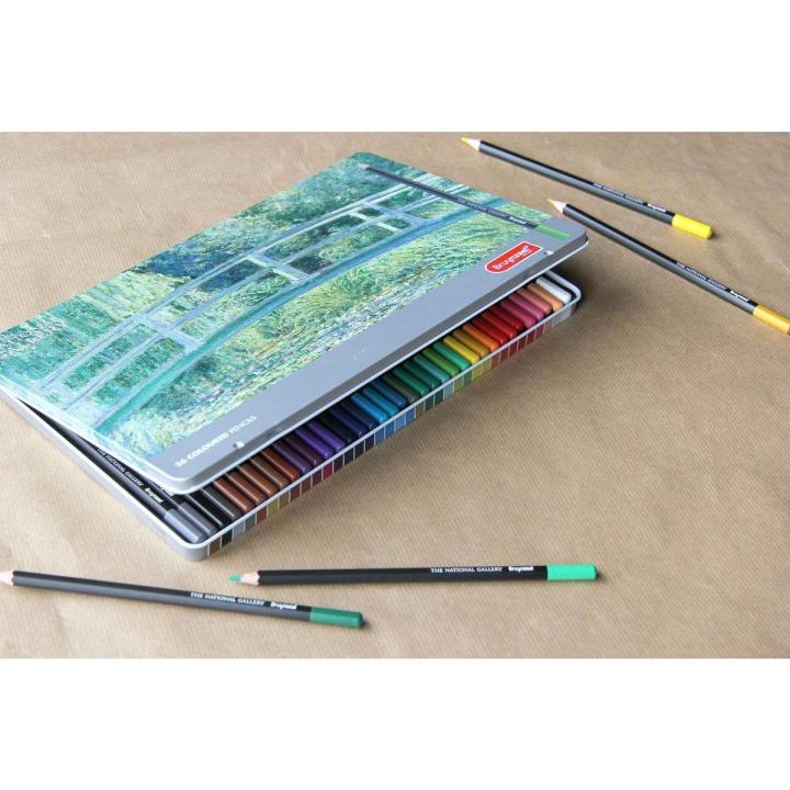Bruynzeel El estanque de nenúfares en Lincence para la National Gallery de Londres. Contiene 36 lápices de colores. Detalle de la portada de Claude Monet El estanque de nenúfares. CARACTERÍSTICA DE PRODUCTO: Marca: Royal Talens Código de barras: 8712079397876 Número de modelo: 5802M36 Dimensiones de la caja: 29,4 x 18,5 x 1,8 cm Nivel de artistas: Profesional