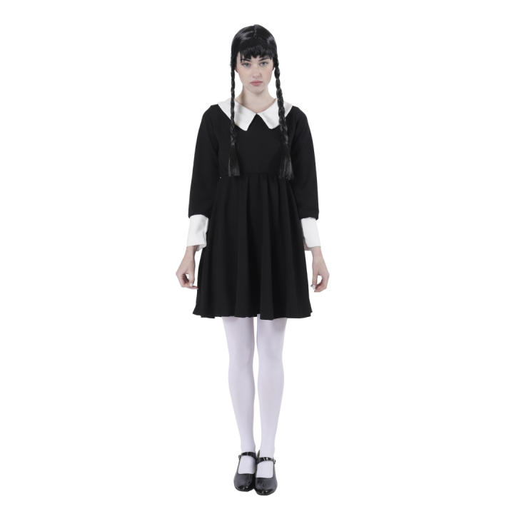 - 💀【DISFRAZ ORIGINAL Y ÚNICO】Usted recibira 1 vestido negro de miercoles. Si has visto la última serie de Wednesay, también querrás hacer cosplay del personaje Miércoles en vivo. Con nuestra disfraz puedes complementar tu look de la niña gótica Miércoles real. Esta serie de Netflix de la hija de los Addams, Miércoles, también ha servido para volver a poner en el punto de mira a esta familia que lleva en pantalla desde los años 60 .