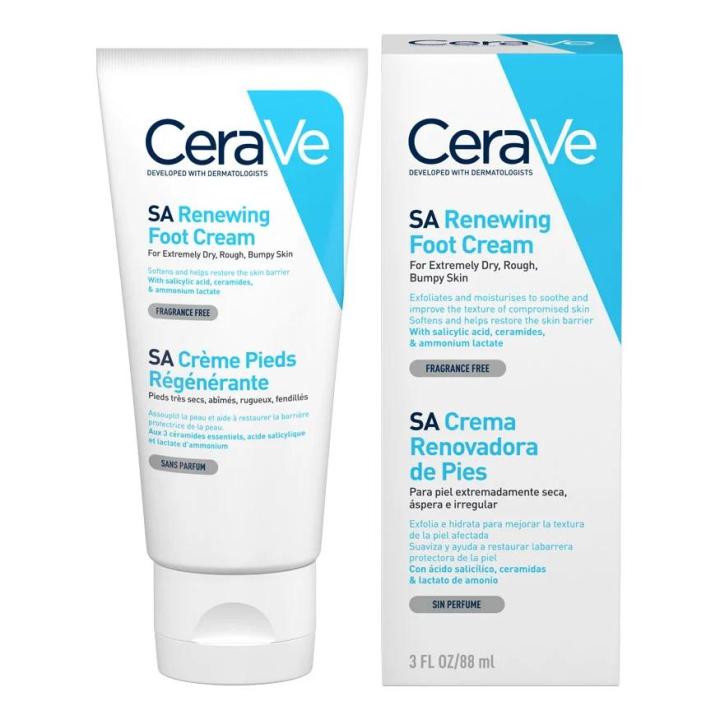 La Crema Renovadora de Pies de CeraVe está formulada con Ácido Salicílico y 3 ceramidas esenciales, que exfolia, hidrata intensamente la piel agrietada o extremadamente seca, mientras ayuda a restaurar la barrera protectora de la piel. Sin perfume. Humecta de manera efectiva y es de rápida absorción, no grasosa.