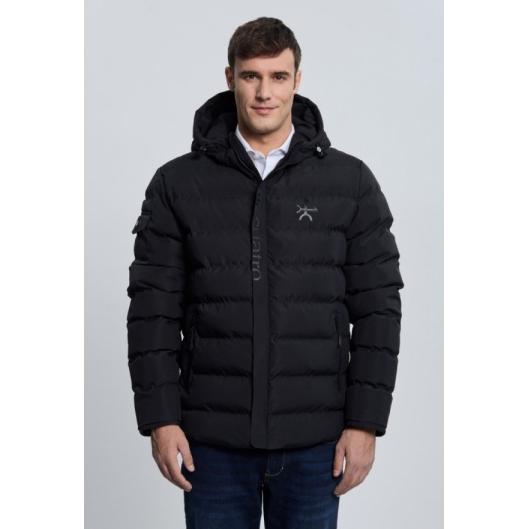 Chaqueta acolchada negro de corte clásico. Capucha con cordón de ajuste. Cierre mediante cremallera de doble carro. Dos bolsillos exteriores con cremallera la manga y serigrafía en el pecho.