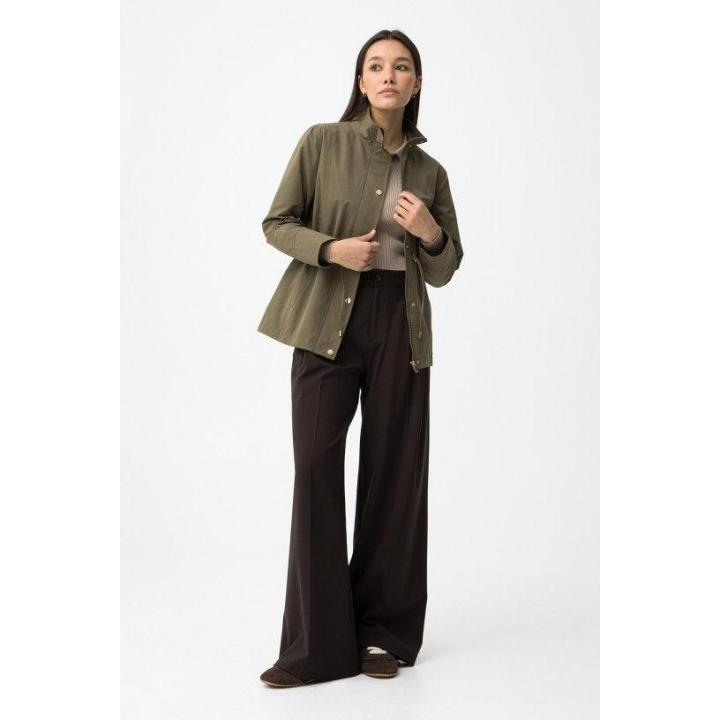 Casaco azul oscuro con ajuste regular, cierre de botones y cordón en la cintura.