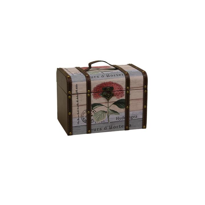 Cofre / baúl de cuero con estampado floral, ideal para usar como joyero o como maceteroCofre floral de madera forrado con cuero marrón, como diseño tiene flores estampadas en tonos verdes y rosas sobre fondo gris.
