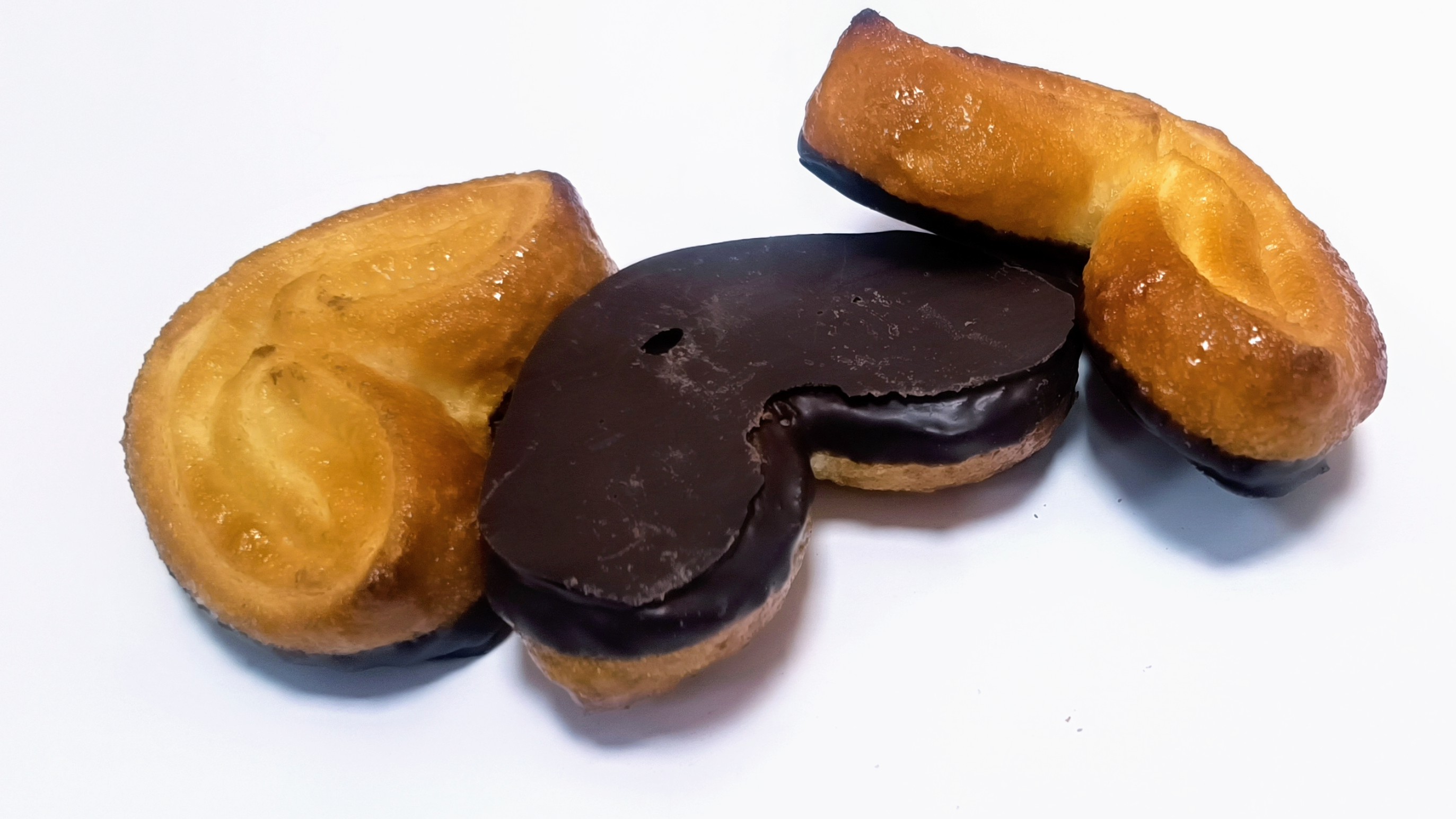 La palmerita fina de hojaldre es un delicioso dulce de repostería que se caracteriza por su hojaldre crujiente y su cobertura de azúcar que le brinda un toque dulce y caramelizado. El medio baño de cobertura vegetal de chocolate hace que tenga un sabor muy agradable.