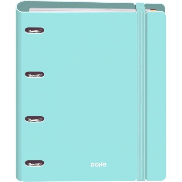 Dohe serenity carpeta fabricada en polyfoam reciclado de 2mm de grosor de primera calidad. carpeta con mecanismo de 4 anillas mixtas niqueladas de 35mm. y cierre de goma elástica ancha plana color verde. interior de 100 hojas en papel offset de 90 g/m2 con 4 taladros y cuadrícula de 5mm con banda de color pastel.
