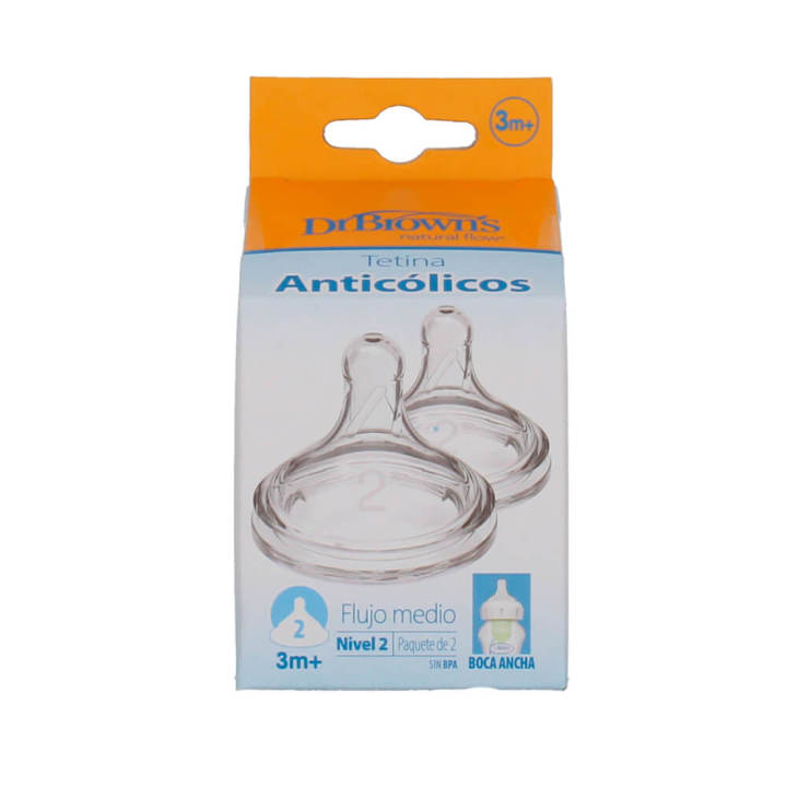 Dr Browns Tetina Boca Ancha Nivel 2 + 3M estas tetinas de repuesto del Dr Browns Nivel 2 están diseñadas para la alimentación del bebé a partir de los 3 meses usando biberones de boca ancha.