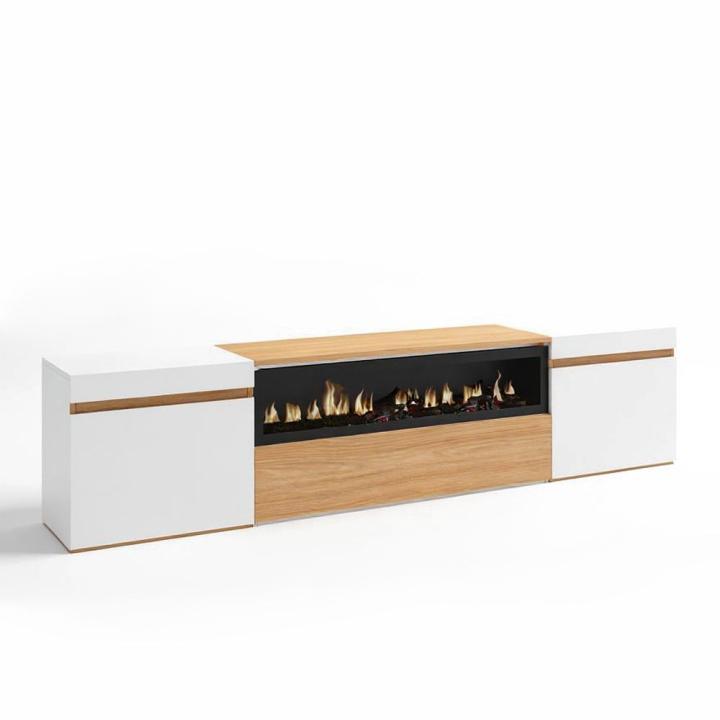 La pieza central de este modelo es su chimenea decorativa con efecto fuego realista, que aporta calidez visual al espacio sin generar calor, humos ni necesidad de mantenimiento. Gracias a la tecnología LED de bajo consumo, el efecto llama se presenta con gran profundidad y movimiento.