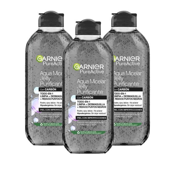 Limpia, desmaquilla y purifica tu piel en una pasada con el agua micelar de carbón y ácido salicílico en gel Garnier Pure Active: Reduce en un 44% las imperfecciones y en un 29% los puntos negros. 400ml