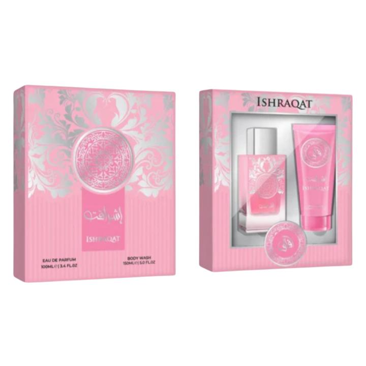 Ideal como regalo para ocasiones especiales o para uso personal, el Gift Set Afaq Ishraqat es una opción sofisticada y práctica para mujeres que valoran el equilibrio entre perfume y cuidado corporal.