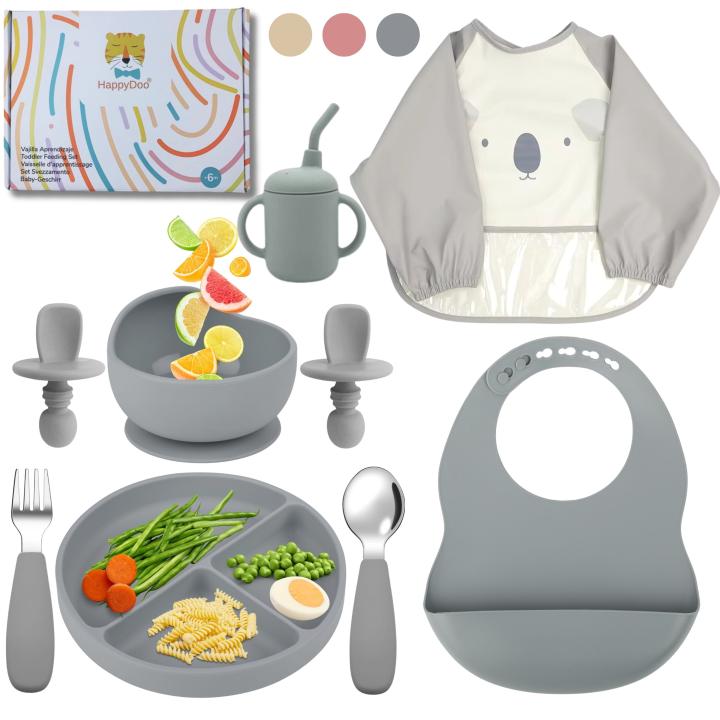 🍽️ VAJILLA BEBE SILICONA 11 PIEZAS. Nuestra vajilla infantil incluye todo lo necesario para la alimentación de tu bebe. Está compuesta por un plato dividido con ventosa, perfecto para la alimentación complementaria, una taza aprendizaje, dos baberos, un babero con mangas impermeable y un babero de silicona suave ajustable al cuello del bebe, bol con ventosa de gran succión, dos cucharas de aprendizaje diseñada para los primeros alimentos sólidos y juego de cuchara y tenedor de acero inoxidable de alta calidad. Todo en una bonita caja para regalar