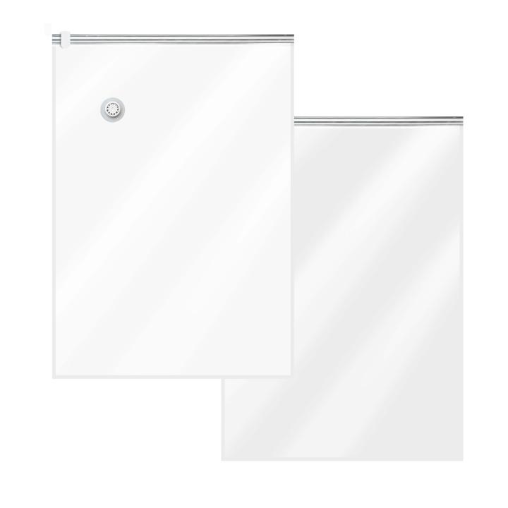 - Prácticas bolsas para guardar ropa, mantas, almohadas, edredones, etc., ocupando poco espacio - Sistema de vaciado del aire mediante extracción con cualquier aspirador - Ahorre hasta un 75% de espacio - Protege la ropa contra insectos, humedad, polvo, olores y moho. - Ideal para almacenamiento de gran volumen. - Bolsa transparente con cierre zip y válvula para extracción de aire - Medidas: 56*80 cm
