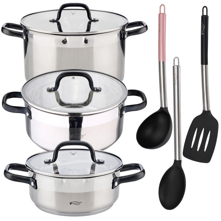 Las ollas se fabrican en el mejor acero inoxidable, con escala medidora, y su base distribuye uniformemente el calor. Tapas de vidrio rectas y elegantes. Con pico de vertido, y elegantes asas y pomos. Las asas y pomos, de cara a facilitar su agarre, permancen siempre fríos mientras cocinas, y son ergonómicos.