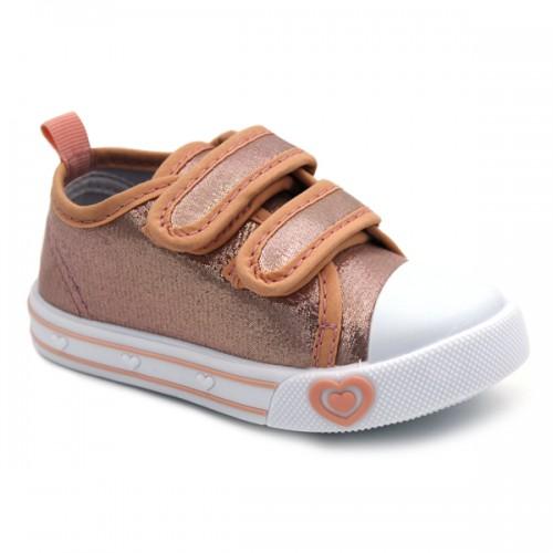 Un estilo converse que a todas las niñas le gustarán. Es de textil metalizado en color rosa champán, oro y plata. Tiene dos tiras de velcro, adaptándose a la perfección. El forro y la pantilla es de textil transpirable. Tiene la puntera reforzada de goma, como es típico en este tipo de zapatillas. La suela es de goma antideslizante y flexible.