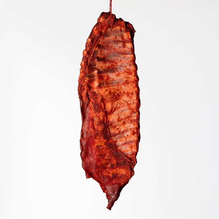 Costillar de cerdo Duroc sometido a un proceso de salazón y macerado en adobo con pimentón, ajo y orégano y posteriormente oreado durante dos semanas. Se acaba coon un toque de leña de roble y encina.