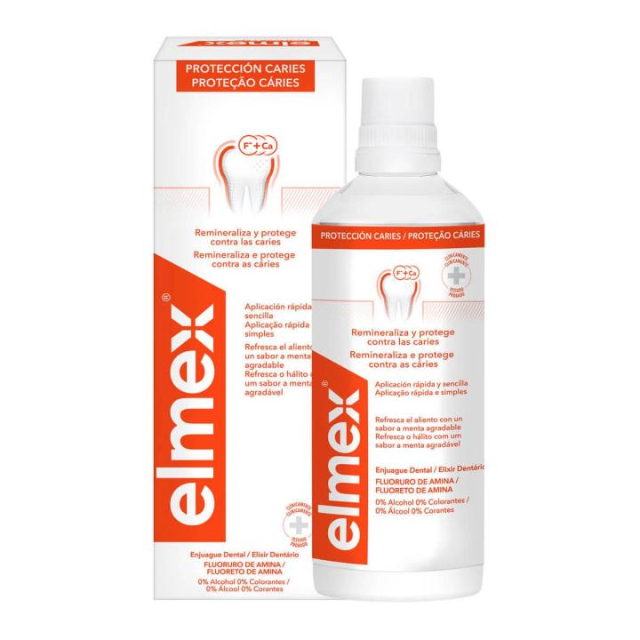 Elmex Protección anticaries es un enjuague bucal de uso diario que contiene fluoruro de amina que ayuda a crear una capa protectora sobre el diente que protege frente a la aparición de caries. Además, su fórmula potencia la remineralización del diente y protege incluso en las zonas de difícil acceso.