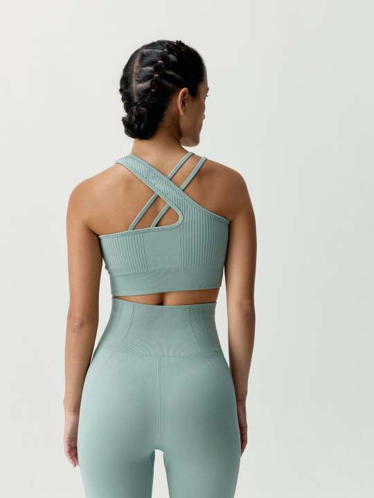 Sujetador deportivo de sujeción media-alta. Tejido “fit_tech”. Tecnología 3D. Tirantes asimétricos en la espalda.