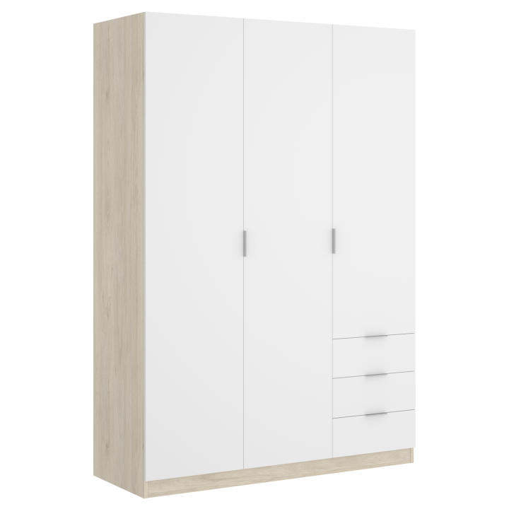 Armario de tres puertas batientes dividido en dos partes: una con una barra y un estante, y otra con dos estantes y tres cajones exteriores.