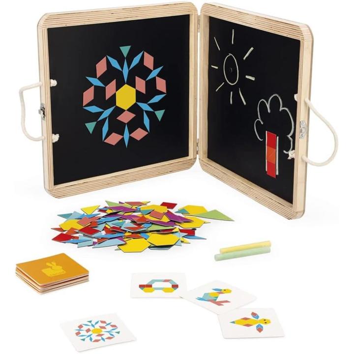 Juego magnético presentado en un estuche de madera que contiene todo lo necesario para crear figuras extraordinarias usando imanes . Elige una tarjeta y reproducela copiando la figura que tenga , o da rienda suelta a tu imaginación para inventar los personajes y animales más locos . Los imanes de formas geométricas permiten construir como si estuviéramos haciendo un puzle o un tangram. Puedes completar el dibujo dibujando con la tiza y una vez acabado cierras y guardas el tablero .