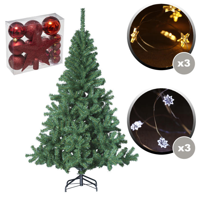 Fantástico pack navideño para la decoración de tu casa. Con este pack podras decorar cualquier parte de tu casa de la forma que desees. Gracias a su diseño se adapta a cualquier tipo de decoración. Este pack incluye: Abeto verde 150 cm . Pack de 18 piezas decorativas de navidad . 6 guirnaldas de cobre de 20 LED para interiores
