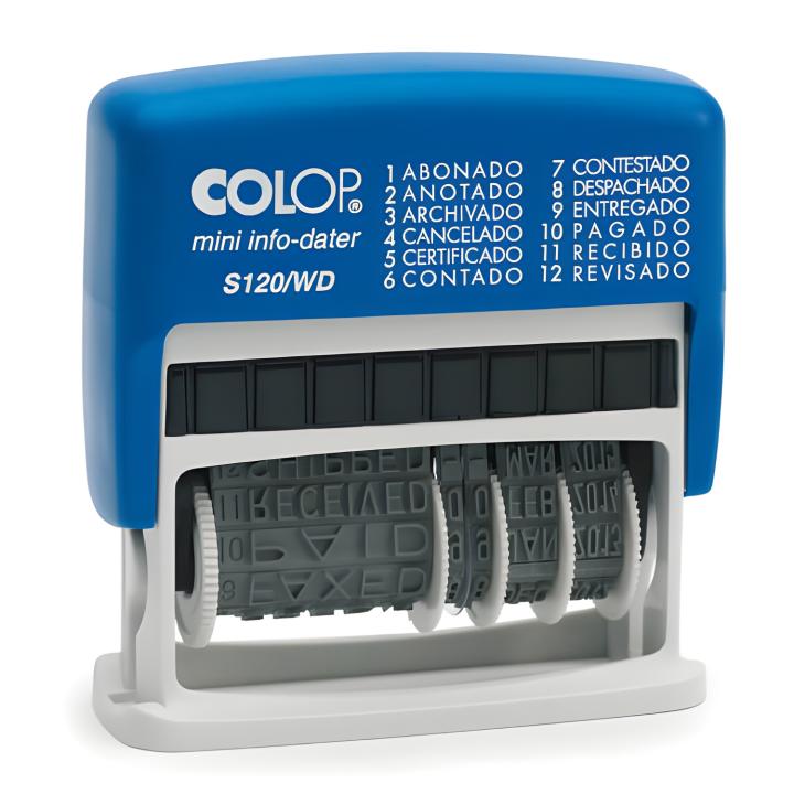 Con el S120/WD de Colop, puede sellar documentos importantes con las frases disponibles en este pequeño sello. Las frases incluyen: ABONADO, ANOTADO, ARCHIVADO, CANCELADO, CERTIFICADO, CONTADO, CONTESTADO, DESPACHADO, ENTREGADO, PAGADO, RECIBIDO y REVISADO. Este sello también incluye una banda para la fecha que le permite incluirla cuando selle documentos. Pequeño y portátil, este sello automático es una solución rápida para sellar varios documentos en un día con tinta nítida y legible.