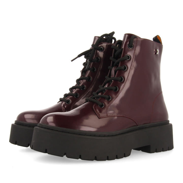- Botín tipo biker con cordones en material sintético burdeos efecto charol.