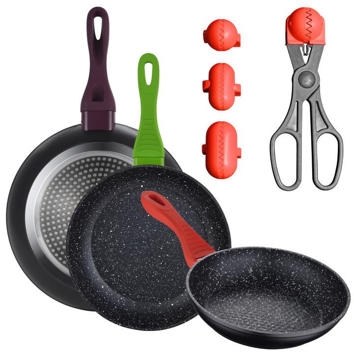 El set de sartenes está compuesto por 1PC Sartén con mango de color rojo Ø20X4.2CM / 1PC Sartén con mango de color verde Ø24X5.0CM / 1PC Sartén con mango de color morado Ø28X5.8CM.